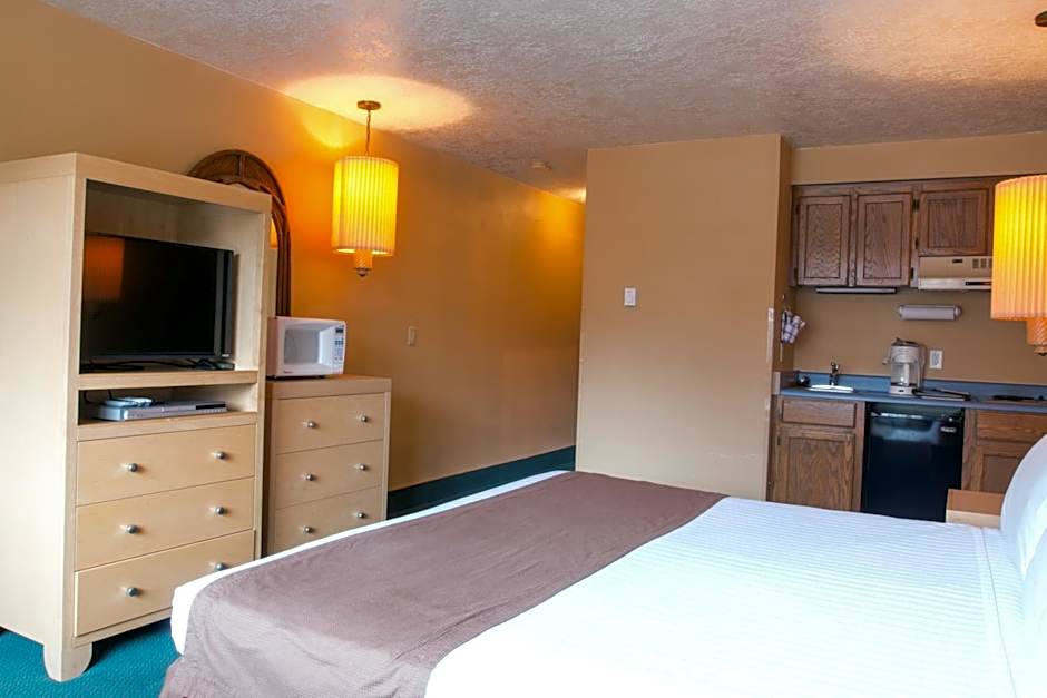 This room includes a microwave, a cable TV, a DVD player, WiFi access, a gas fireplace and a mini refrigerator.